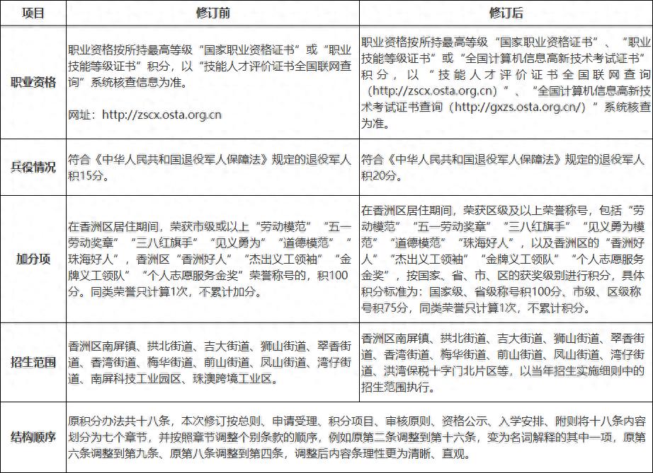 珠海市香洲区人民政府办公室印发修订后的《珠海市香洲区义务教育阶段随迁子女积分入学管理办法》(以下简称新《积分办法》)。该办法旨在进一步规范随迁子女积分入学管理,明确将于2026年5月1日起正式实施,有效期五年。届时,现行于2021年印发的办法将同步废止。修订内容具体为:
