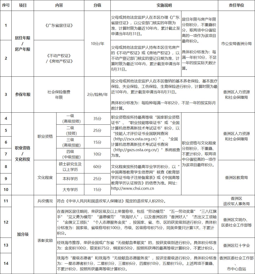 珠海市香洲区义务教育阶段随迁子女积分入学项目及分值表具体为: